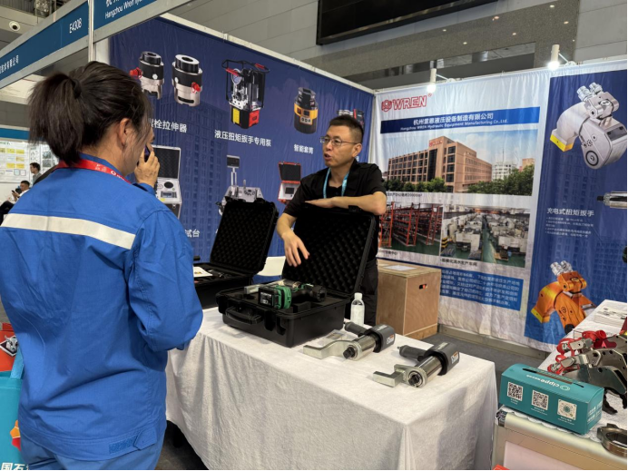 杭州雷恩液压设备制造有限公司也积极参与其中。在展会上,雷恩液压携旗下一系列先进的液压设备精彩亮相,其展品涵盖了液压扭矩扳手、电动扭矩扳手、扭矩扳手泵、液压缸等多种产品,凭借适配油田高压作业环境的特性,吸引了众多参观者的目光。不少专业观众在展位前驻足,详细询问产品性能、应用场景等问题,雷恩的工作人员都给予了专业且耐心的解答。