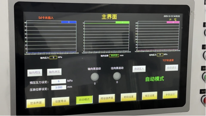 主要功能介绍:两种操作模式:面板操作和显示器操作;油箱温度实时显示;保压设置可同时保压12次;插入SD卡,进行数据记录保存;TCP连接,与客户通讯系统进行连接。
