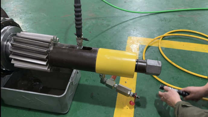 拥有自动和手动2种模式,主要工作原理是:控制柜轴向泵提供轴向压力,通过千斤顶把小齿轮推入内锥孔;径向泵提供径向压力,通过小齿轮内部的油道,进入内锥孔内形成油膜,把内锥孔涨开,以便轴向压力将小齿轮压入。