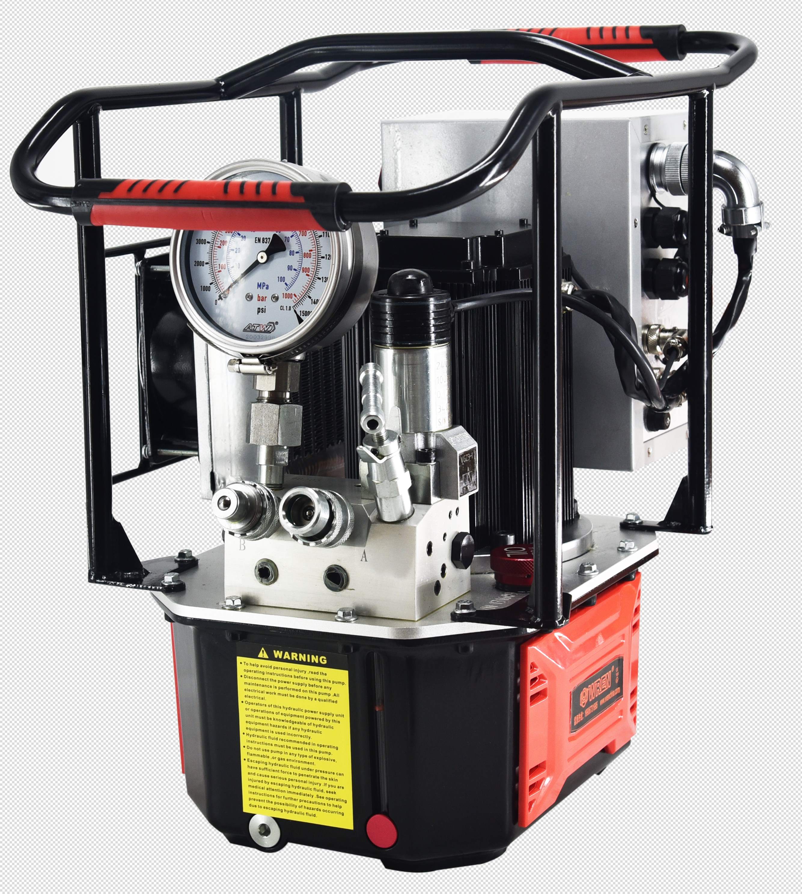 - 电动三级流量液压扭矩扳手泵 - 可选择连续多个扭矩扳手操作 - 自带油冷却器,适合连续操作,带外保护钢架 - Φ100压力表,铝制油箱带油位指示器 - 70~700bar之间各种压力调节 - 可连续操作设计,软管米数可选 - 通过德国莱茵TUV认证及欧盟CE认证
