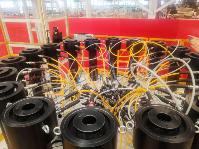 经过数周的生产与严格检测,这套同步拉伸装置的每一台拉伸器都通过了多重质检,控制柜的程序运行也反复调试无误,最终达到出厂标准,整装发往客户施工现场。