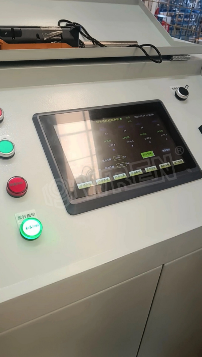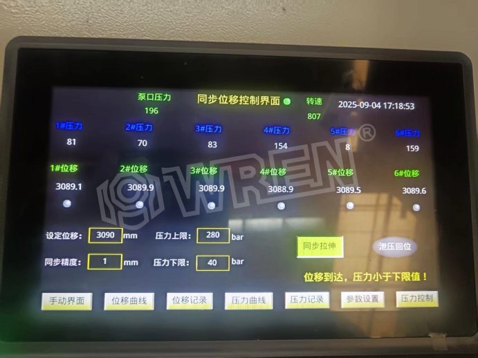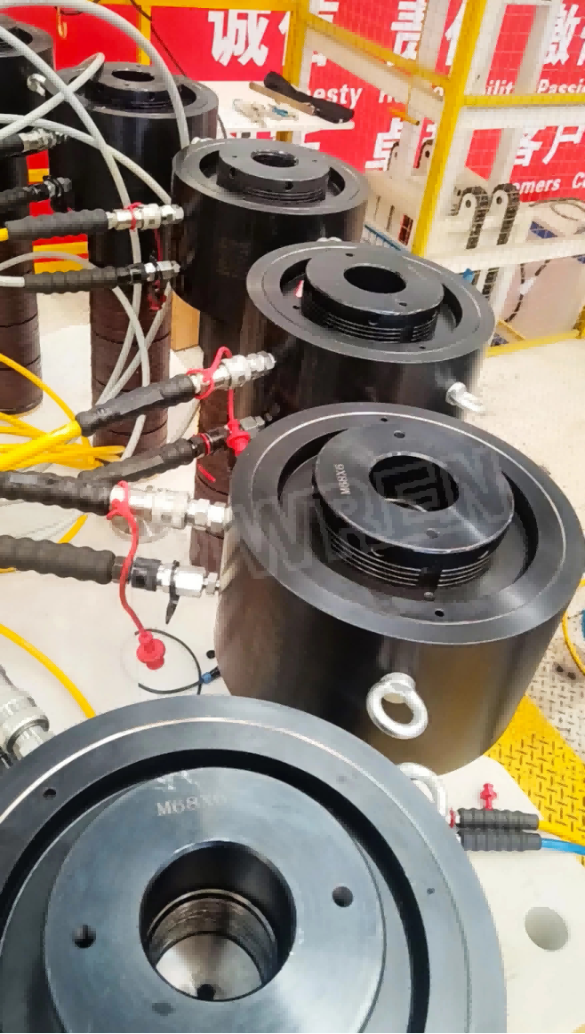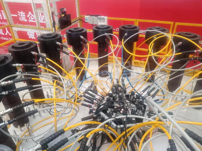 针对这一需求,雷恩工程师结合客户设备的螺栓规格、法兰尺寸等参数,量身定制了一套同步拉伸装置—— 整套系统由 1 台智能控制柜、18 台液压螺栓拉伸器及配套液压油管等部件构成。这套装置的核心优势在于:18 台拉伸器可同时对 18 个螺栓施加拉力,实现“同步受力、同步紧固”,避免法兰面变形;同时,所有拉伸数据(如拉伸力、压力、时间)均可在控制柜显示屏上实时显示,便于操作人员监控与记录,完全契合客户对“高精度、高效率、可追溯”的需求。