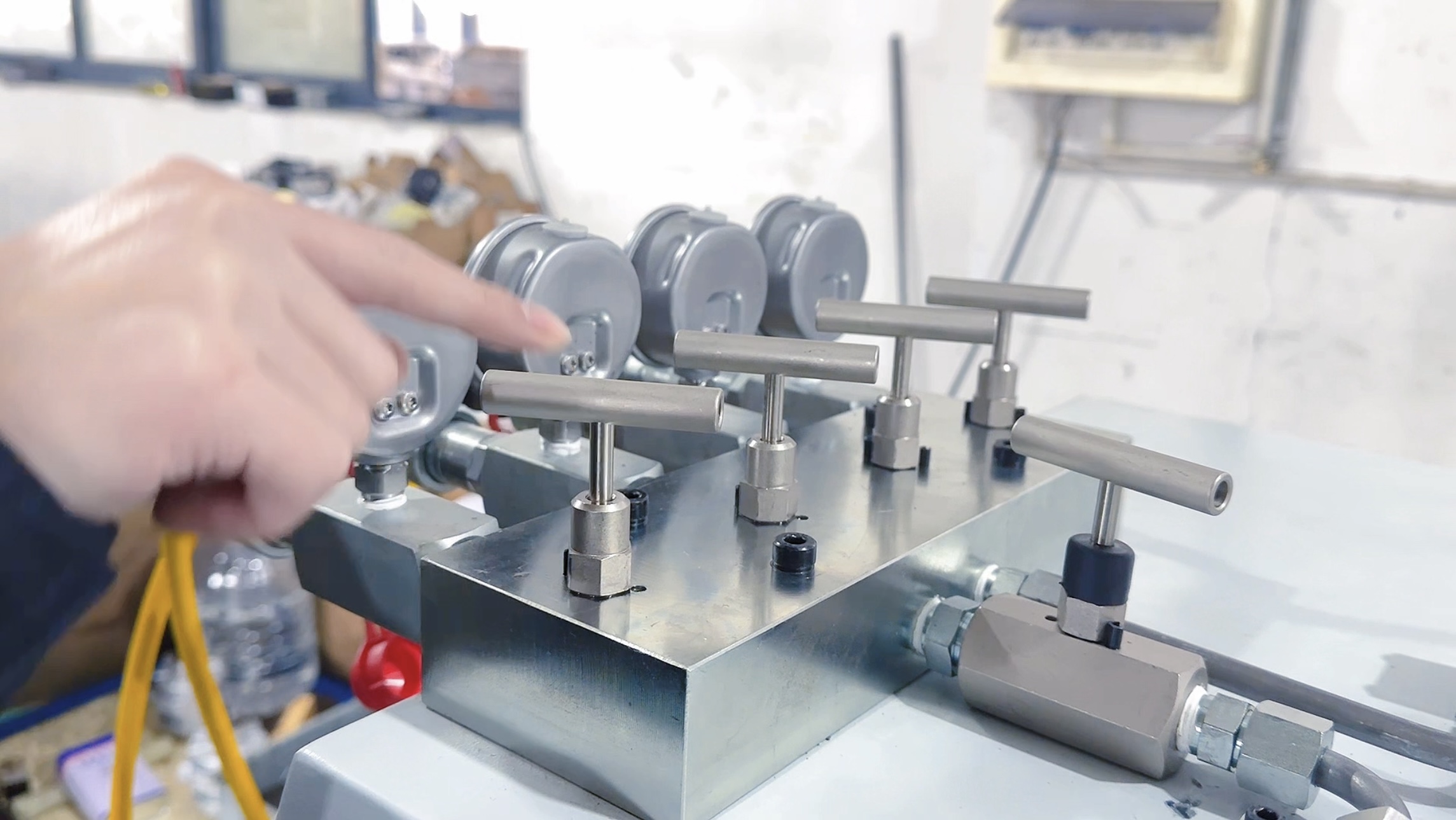 控制柜、触摸屏和分配器处都可读取压力,分配器各出口管路上分别配备手动截止阀和压力表。